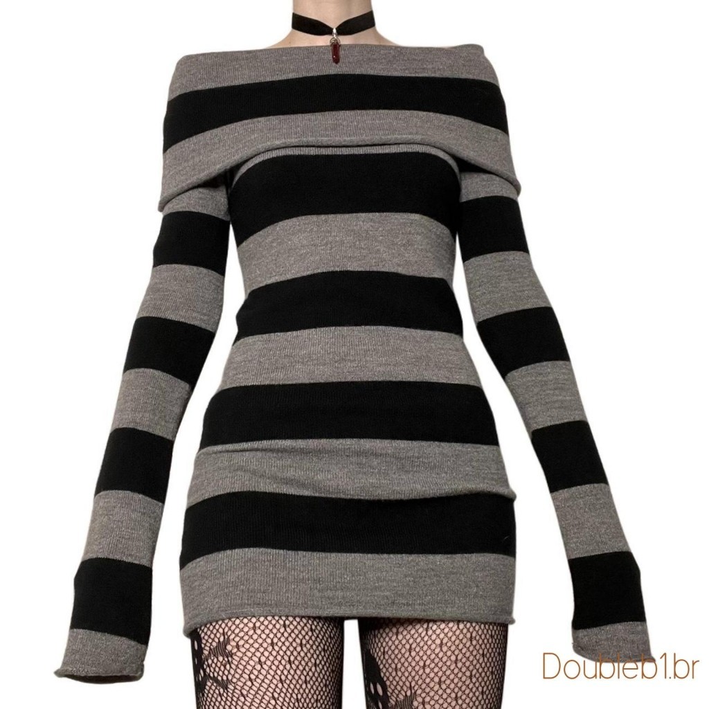 Dou-Women Mini Bodycon Vestido De Listras De Barco Manga Longa Primavera Festa De Anca Envolvido No Outono