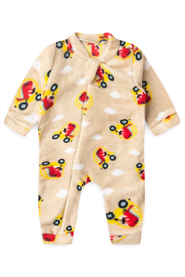 Macacão Bebê sem Pé Masculino Fleece Bege Carrinho (RN/P/M/G/1) - Bebê Fofuxo