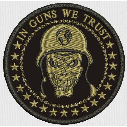 PATCH 8cm BORDADO CAVERIA IN GUNS WE TRUST com carrapicho, para costurar ou termocolante