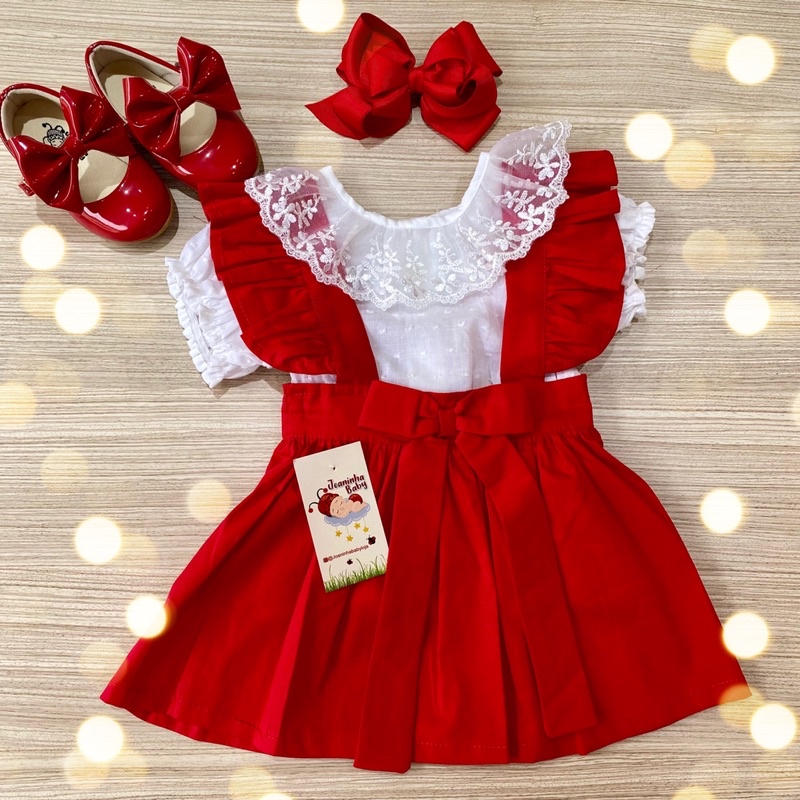 Salopete Infantil Vermelho Natal Menina Bebe Rendado Lizzie