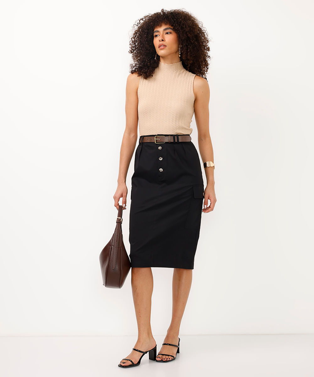 saia midi de sarja com bolso cargo e cinto preta