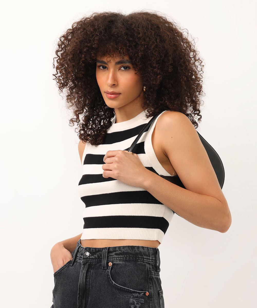 cropped de tricot canelado e listrado preto