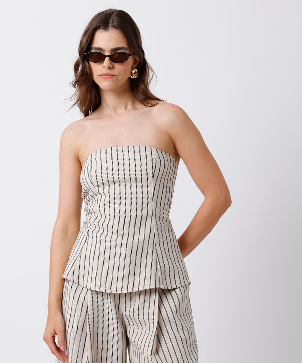 blusa peplum feminina com linho sem alça listrada mindset off white