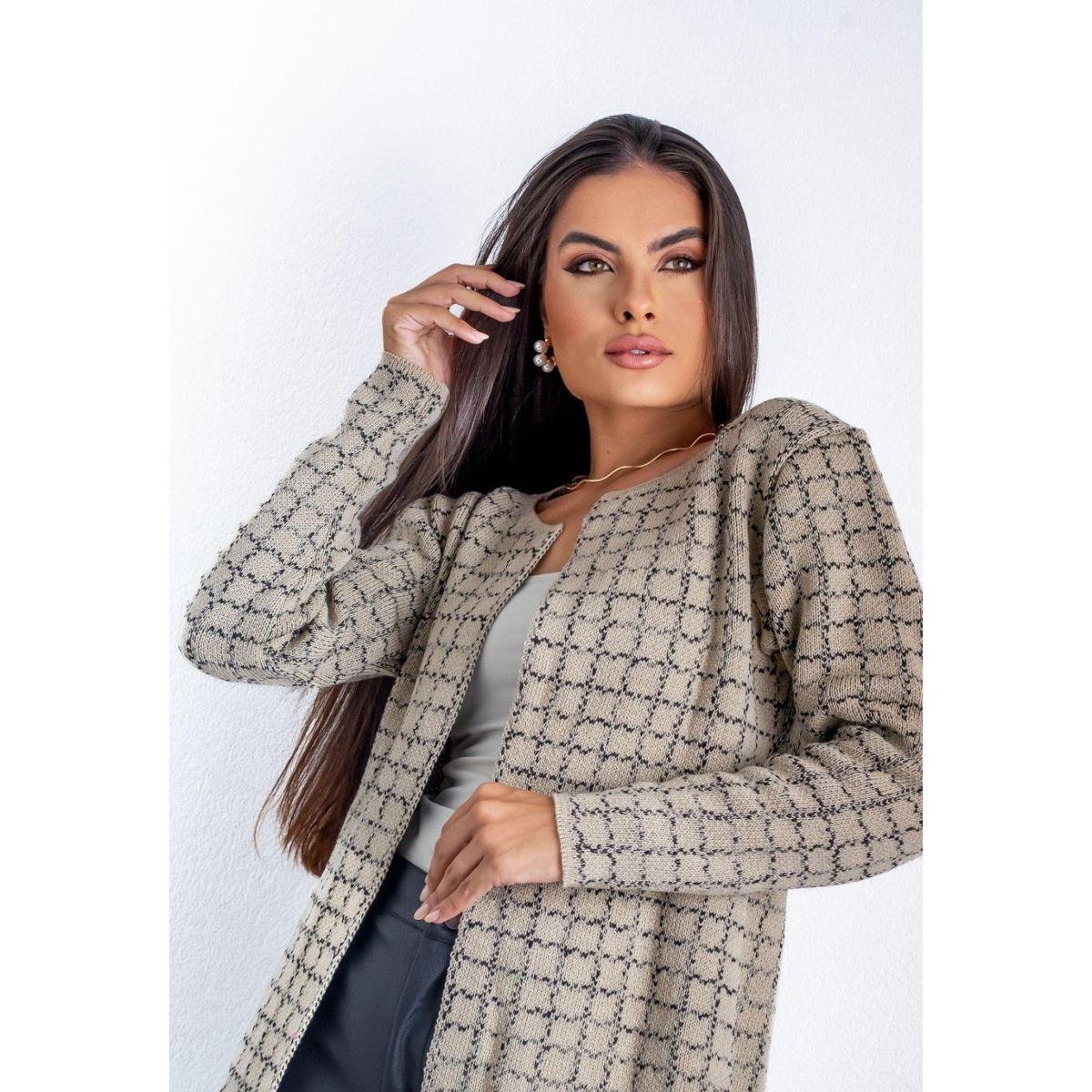 Casaco Cardigan Tweed de Tricot Mescla e Estampa Geométrica Feminino