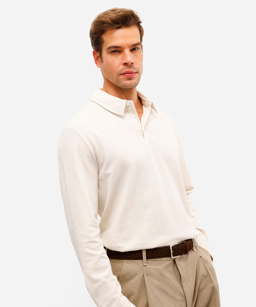 polo masculina de algodão manga longa texturizada off white