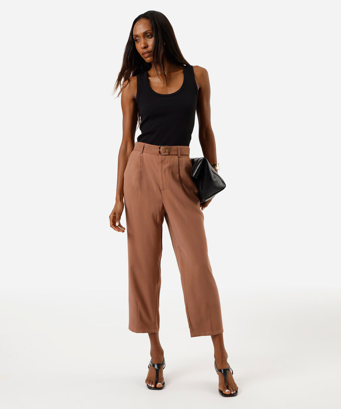 Calça Alfaiataria Social Feminina De Poliéster Cintura Alta Com Cinto Bolso .