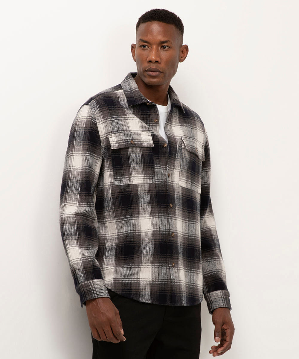 camisa comfort de flanela manga longa xadrez azul marinho