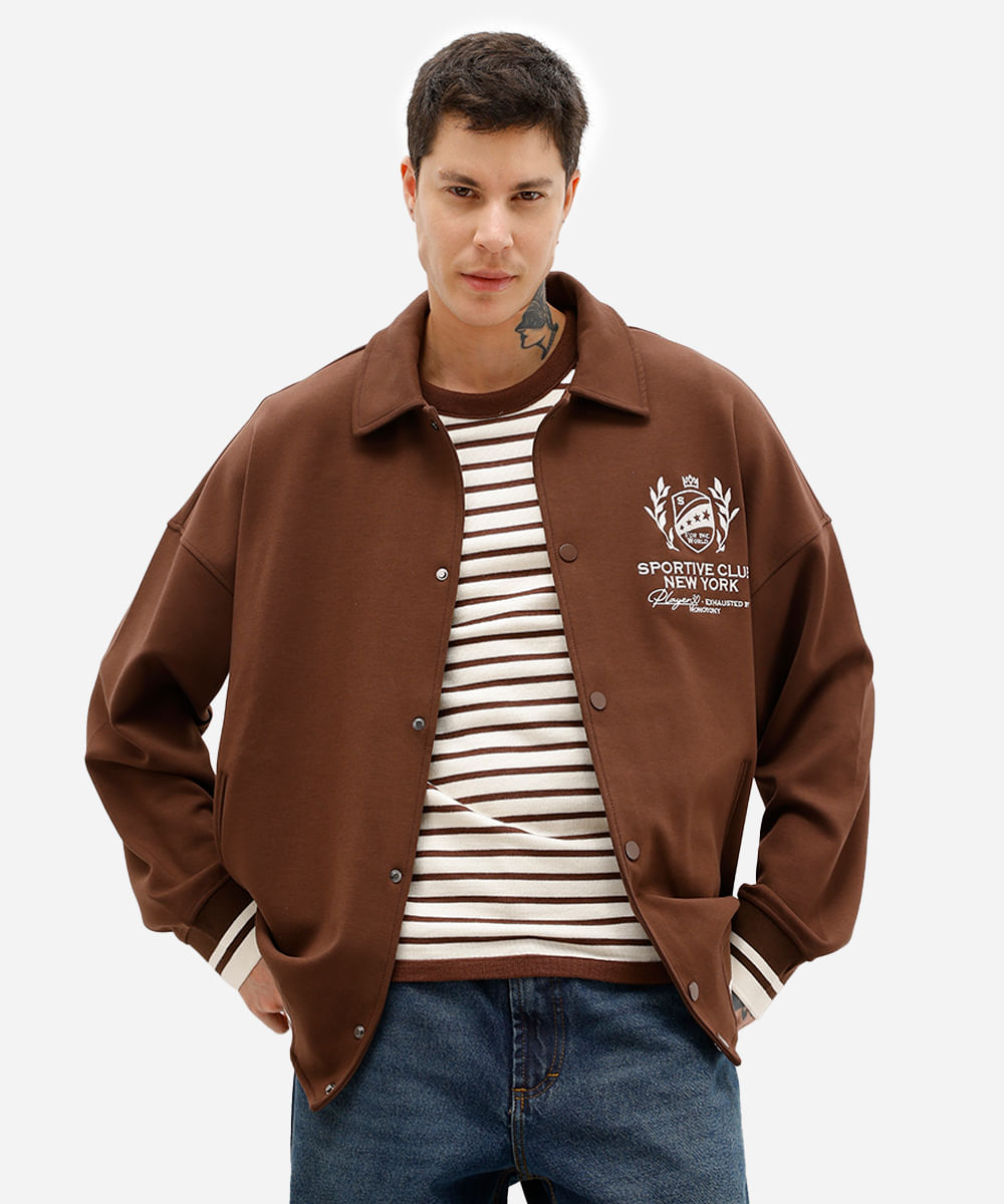 jaqueta bomber college masculina de moletom com bordado peanuts marrom