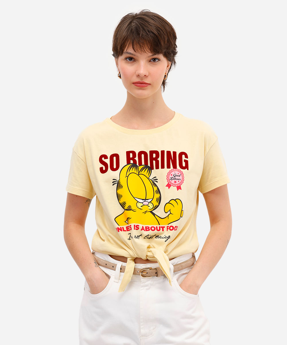 camiseta feminina de algodão garfield texturizada com amarração amarela