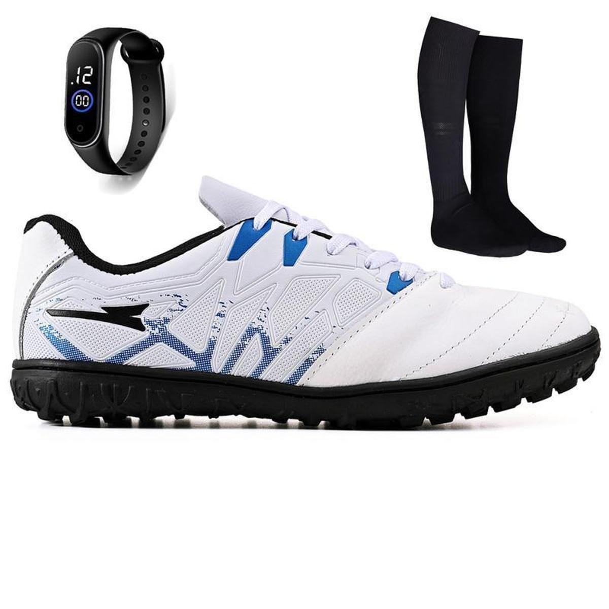 Kit Chuteira Futebol Society Bico de Couro Grama Sintetica + Meião + Relogio Adulto