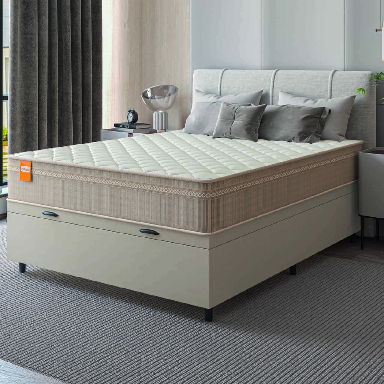 Cama Box Baú Casal Colchão Molas Qatar 138x188x63cm Bege/Branco Inducol - Suporta Até 200 Kg Por Pessoa