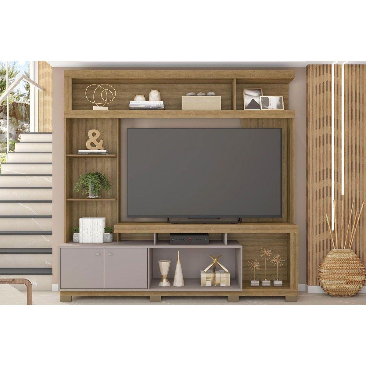 Rack Bancada c/ Painel p/ TV até 70 Pol Formosa Nicho e Pés 210x207cm Lamina Mel/Cacao - Caemmun
