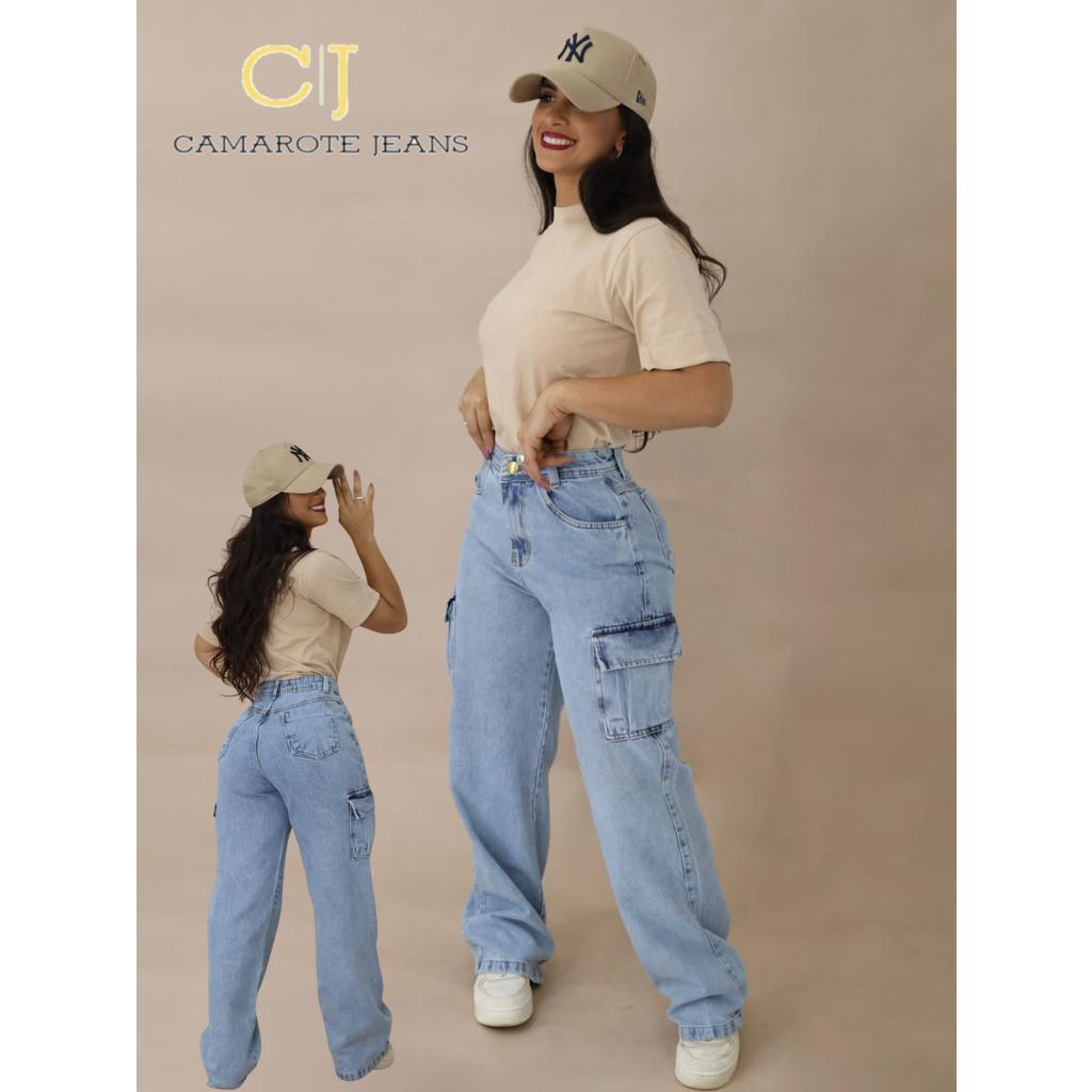 Calça Jeans feminina Pantalona Wide Leg Cargo com Bolsos na Laterais