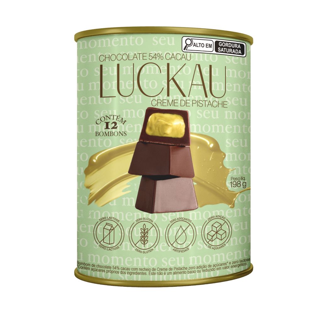 Bombom de Chocolate 54% Cacau recheado com Creme de Pistache SEM GLÚTEN SEM LACTOSE SEM AÇÚCAR Luckau - 12 bombons - 198g
