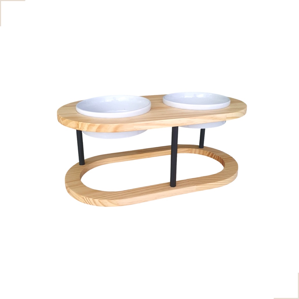 Comedouro pet elevado duplo P em madeira e porcelana para cachorro e gato