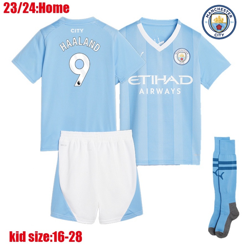 23-24 Manchester City Home Camisa De Futebol Kit Infantil Haaland Grealish De Bruyne Foden Conjuntos De Esportes Camisola Com Meias