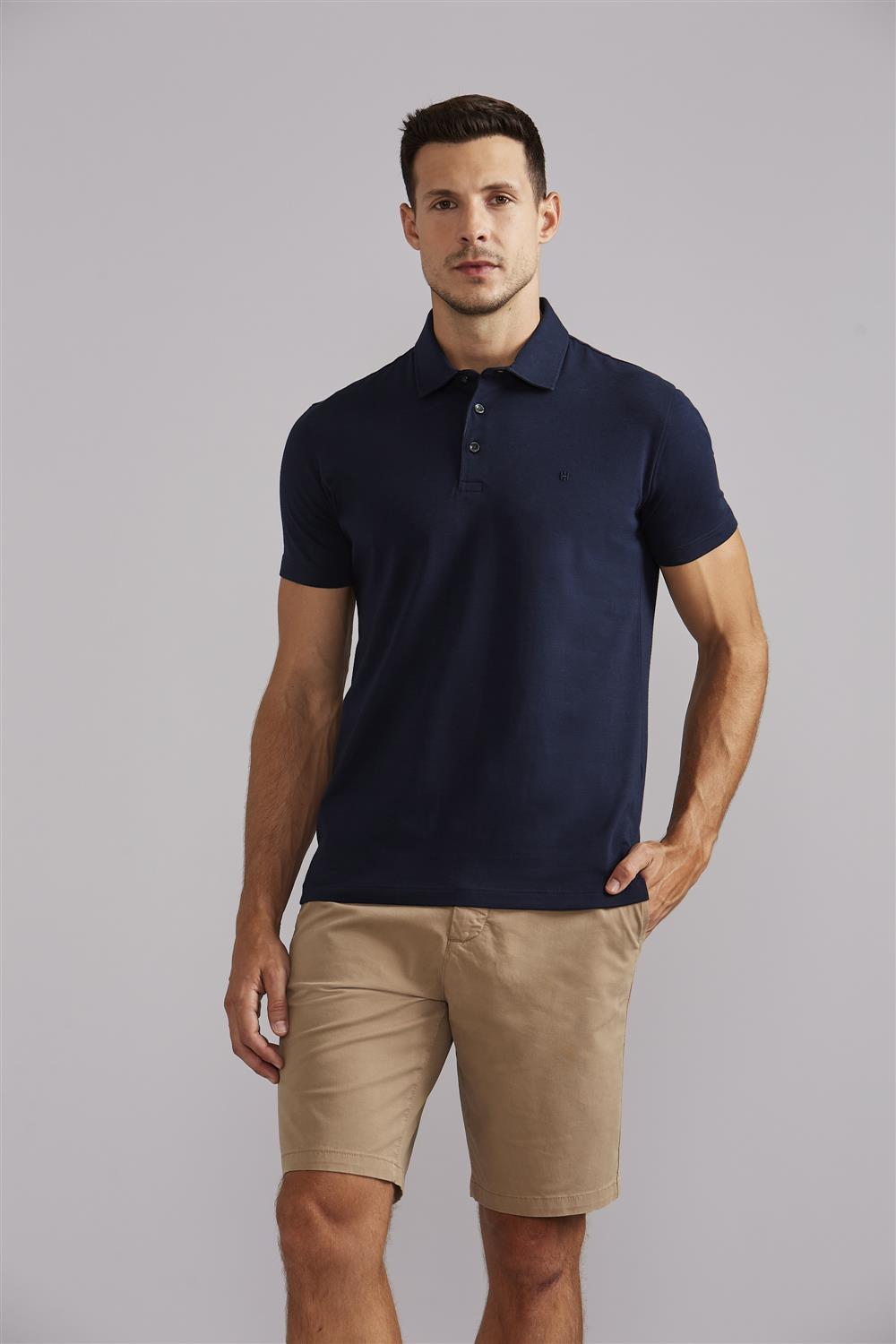 Camisa Polo Manga Longa Malha Slim Fit - Azul Marinho