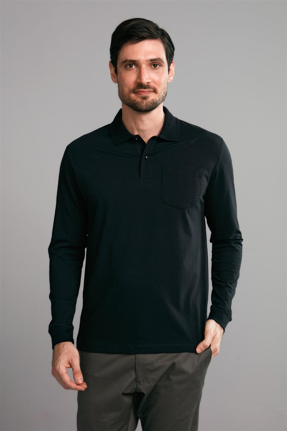 Polo Manga Longa com Bolso Comfort Premium - Preto