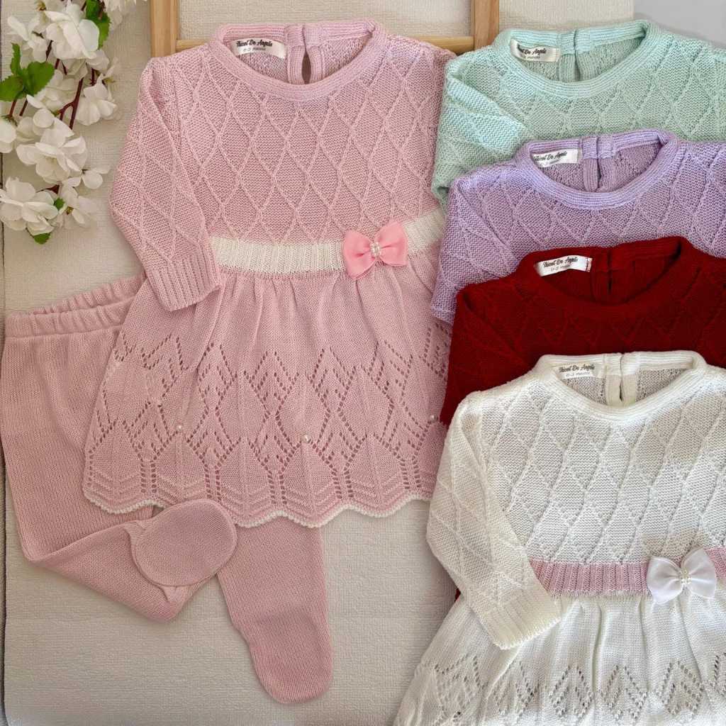 Vestido com Calça Pezinho e Faixinha Bebê Menina Tricô Maternidade/Princesa Bordado Perolas