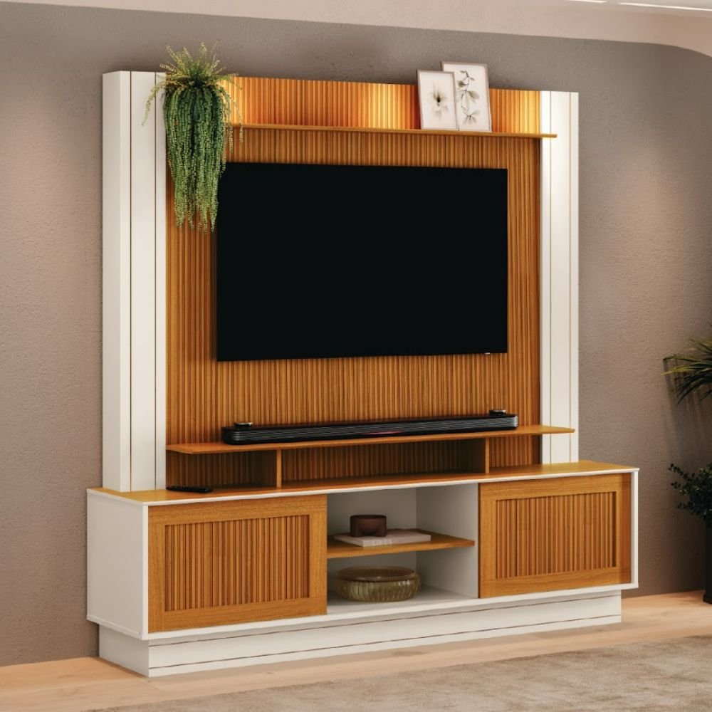 Estante Home para TV até 55 Polegadas Impressão Ripada Cross Off White Com Tauari - Lukaliam Móveis