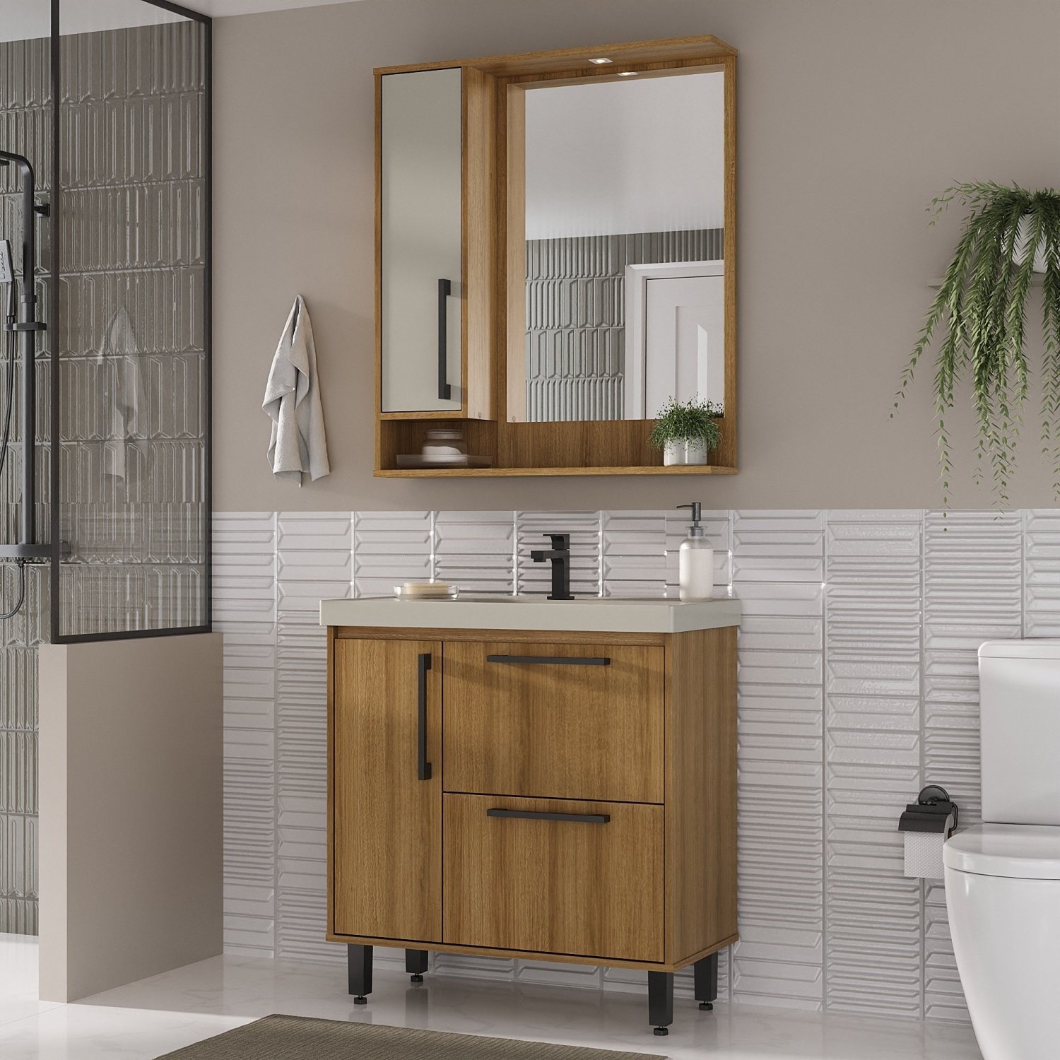 Conjunto completo de Banheiro MDF com Armário e Gabinete com Pés Com Espelheira e Cuba Madri 80cm