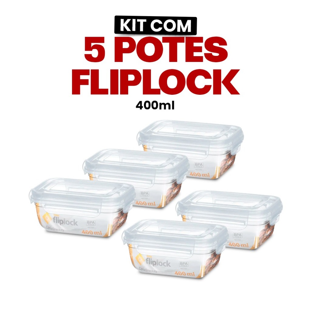 Kit 5 Potes Em Plástico Herméticos Com Tampa de Alta Vedação Fliplock 400ML Rischioto - Marmita Lanches Frutas Saladas Fitness