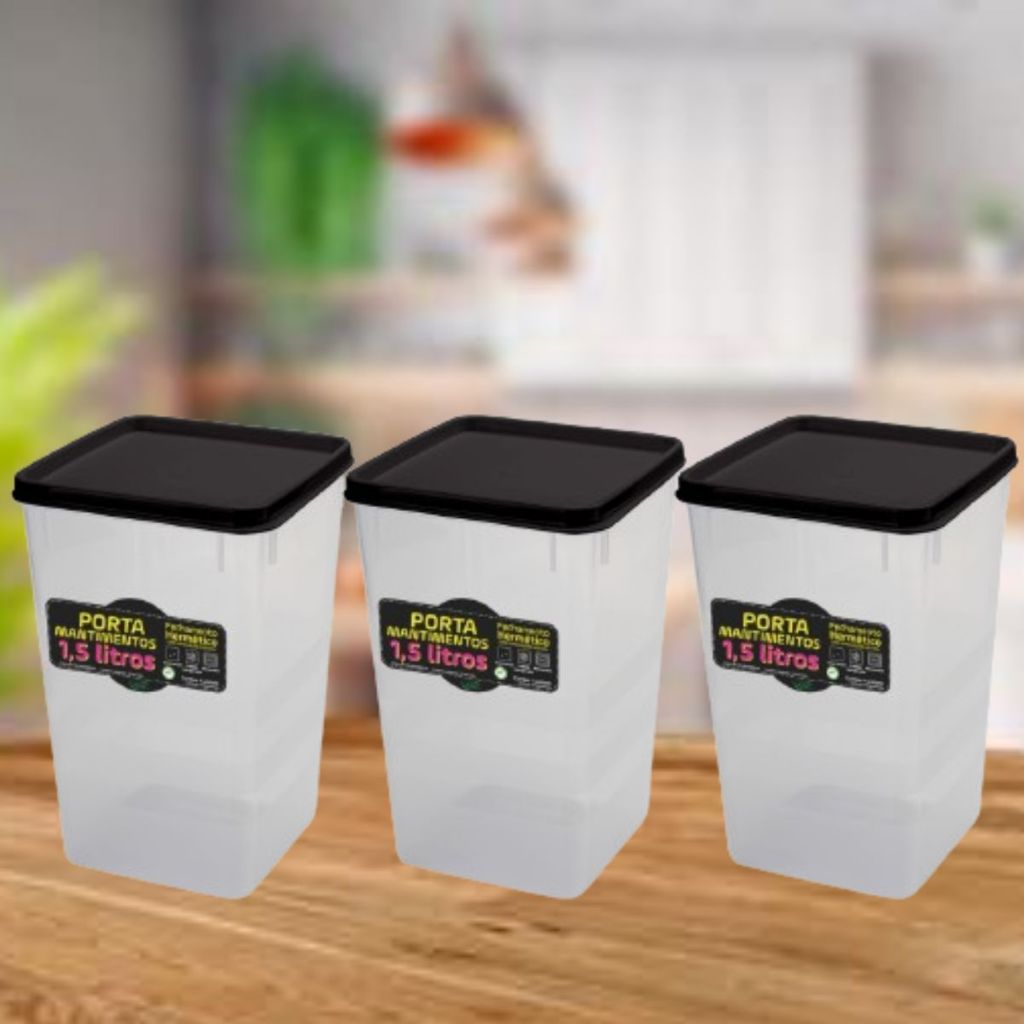 Kit 3 Potes Mantimento Hermético 1kg de Alimento Capacidade de 1,5 Litros Tampa Preta Empilhável Cozinha Feijão Cereal