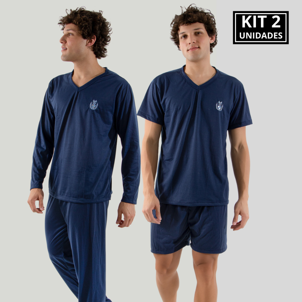 KIT 2 Pijamas Masculino Comprido + Curto Malha Confortável Verão e Inverno