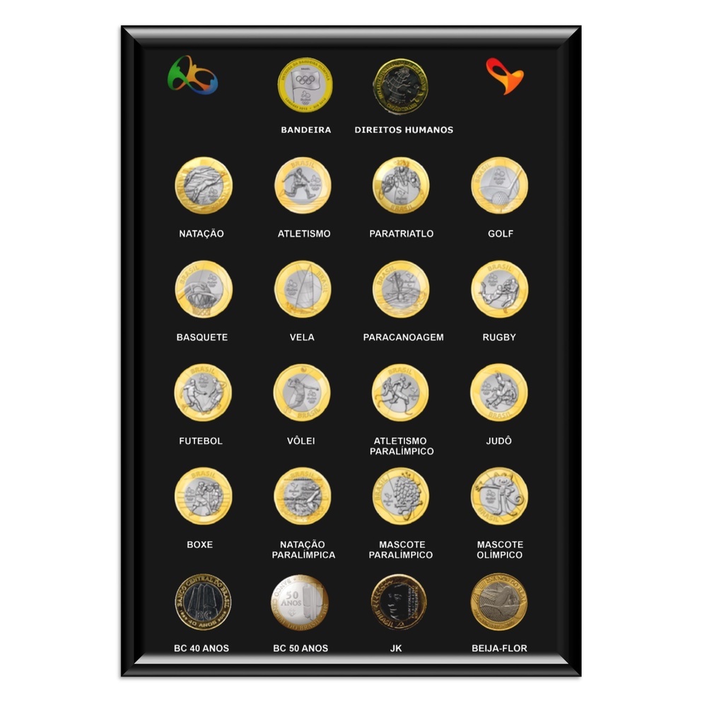 Quadro Album Expositor Porta Coleção Moedas Comemorativas Plano Real Olimpiadas RIo 2016 Jogos Olimpicos Direitos humanos Bandeira Casal FAO JK Banco central 40 e 50 anos Juscelino Kubitscheck Entrega da bandeira Beija Flor Colecionador presente