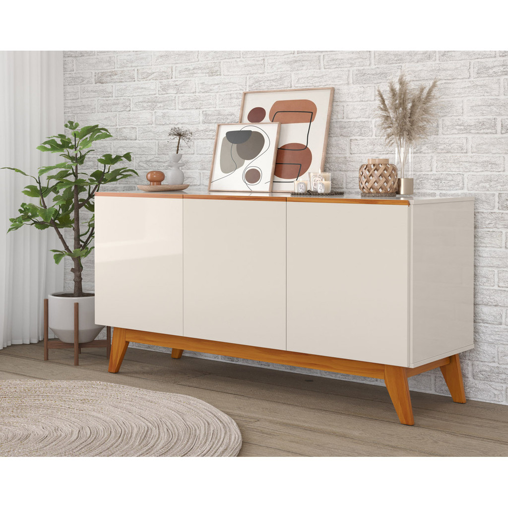 Aparador Buffet 3 Portas Ares Lux Pés Madeira Decoração Cantinho Café Cozinha Sala Moderno Bar
