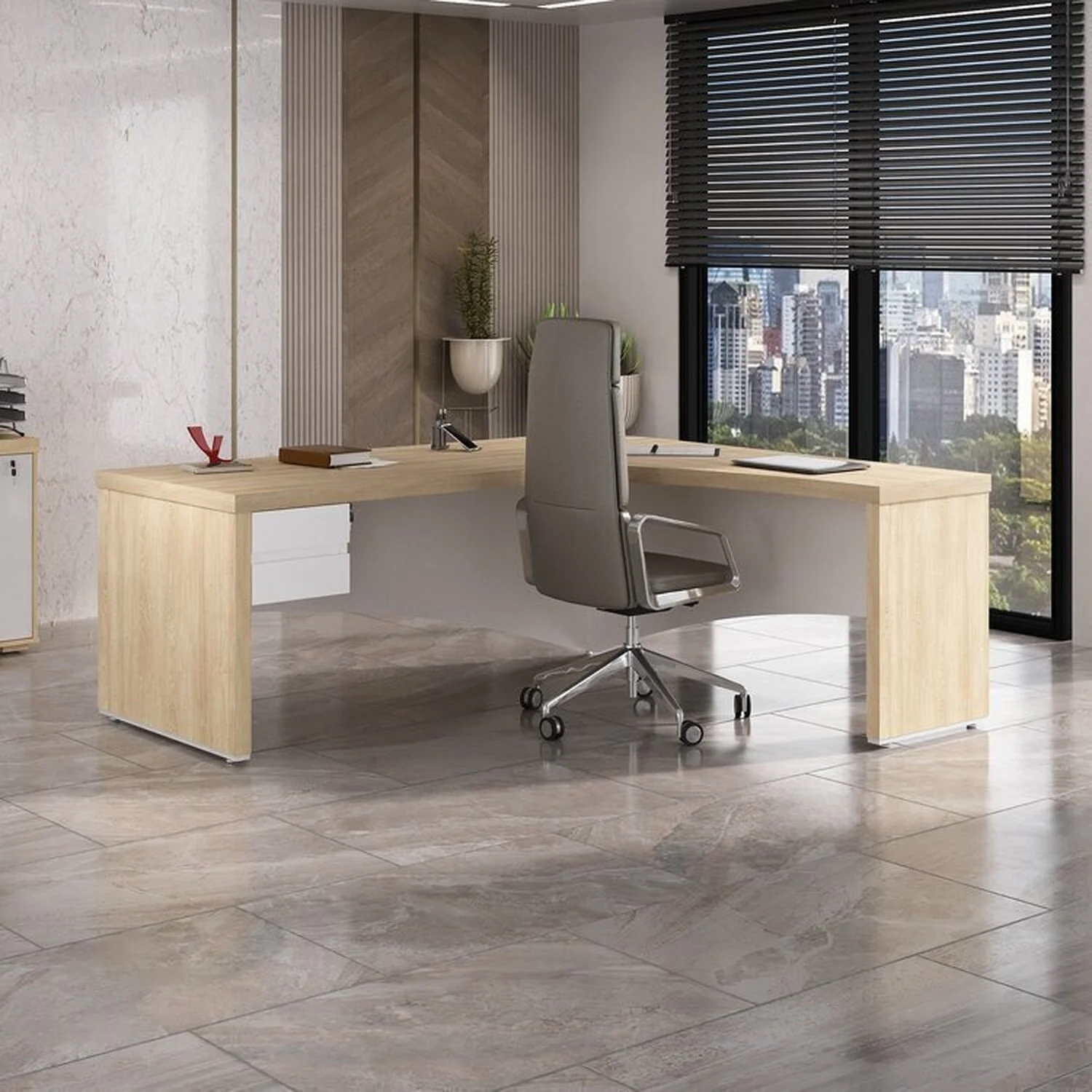 Mesa Diretor para Escritório em L e Tamburato com Gaveteiro Suspenso Organizador 2 Gavetas 2000cm Carvalho E Branco