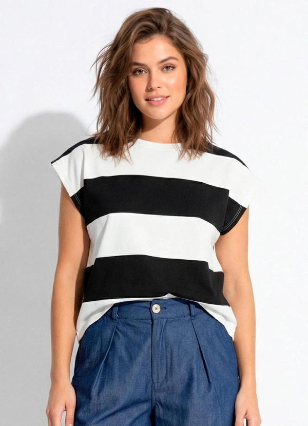 Quintess - Blusa Listrado Preto e Branco em Malha de Algodão