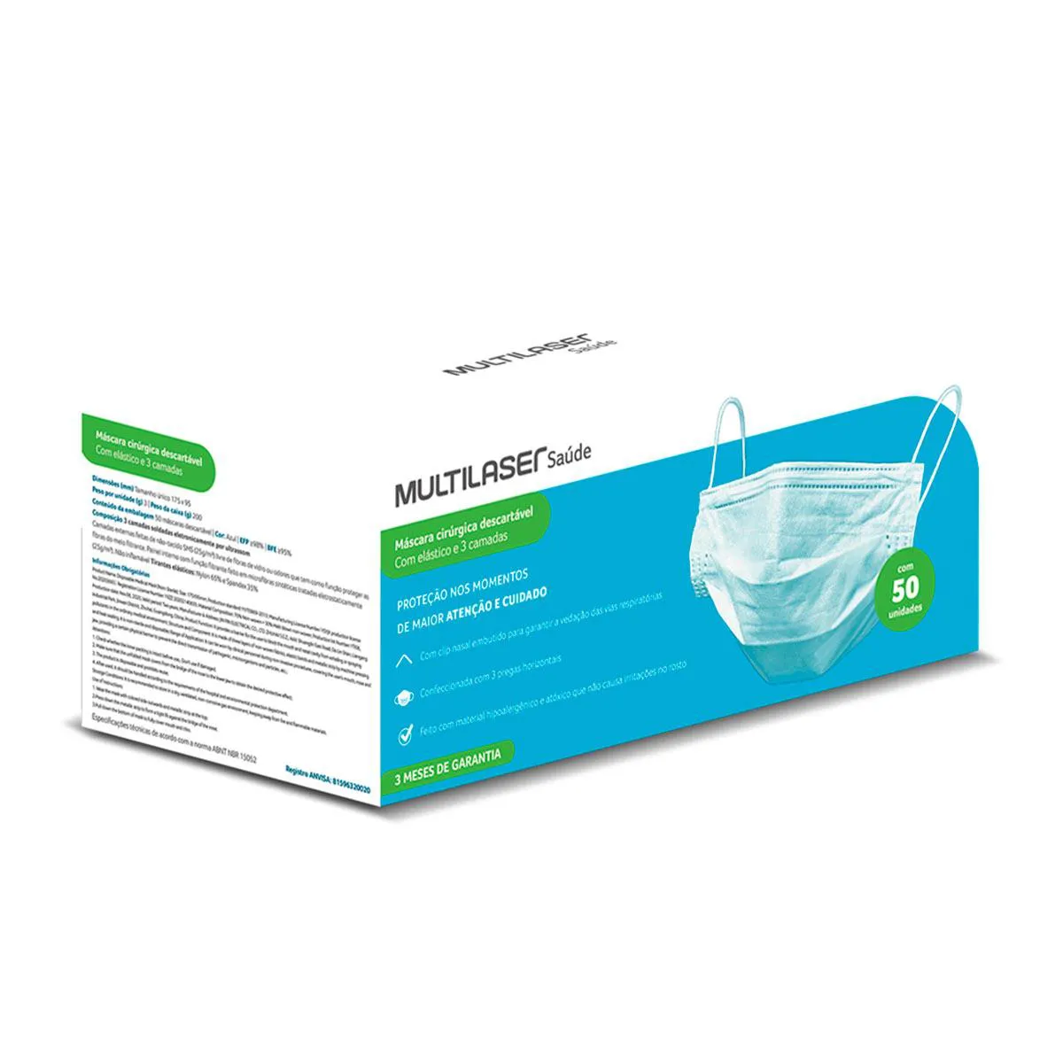 MáSCARA 3 CAMADAS DESCARTáVEL AZUL - CAIXA COM 50 UNIDADES - MULTILASER SAúDE - HC400 HC400
