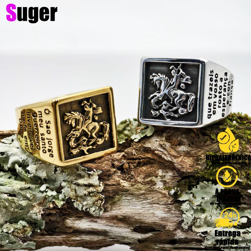 Anel Religioso Masculino São Jorge com Oração Católica Aliança de Aço Inox Maciço - Produto Original