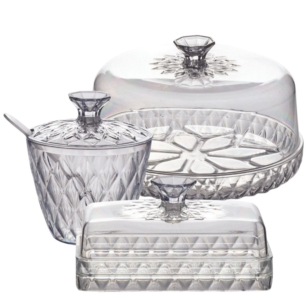 Kit boleira com pé, queijeira, açucareiro e manteigueira de plástico Cristal incolor Plasutil