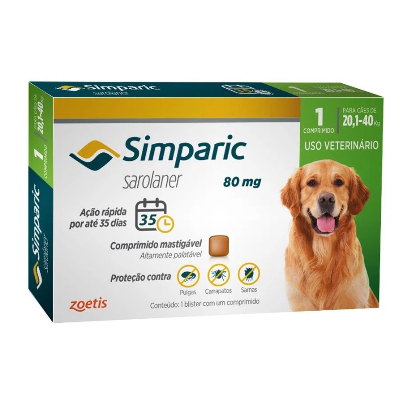 Anti Pulgas e Carrapatos Simparic Cães de 20,1 a 40 Kg - 80 Mg 01 Comprimido - Zoetis