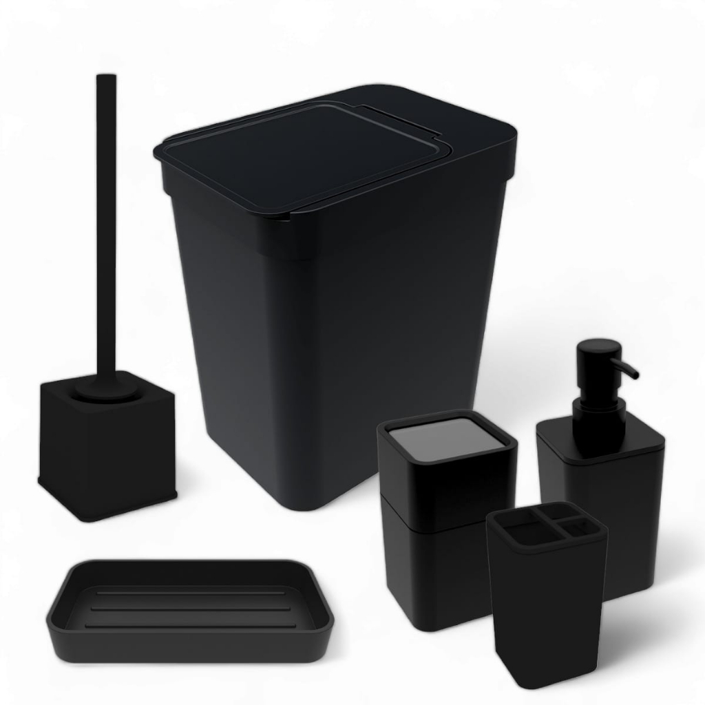 Kit Acessórios Banheiro Lavabo Preto Completo Lixeira Porta Sabonete Escova Cotonete Escova Sanitária Conjunto