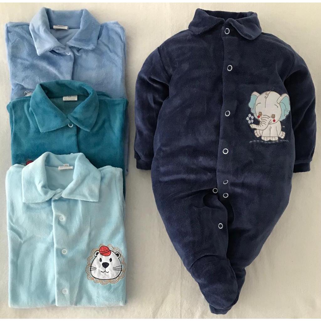 Macacão de bebê plush bordado P M G com pezinho fechado, menino.