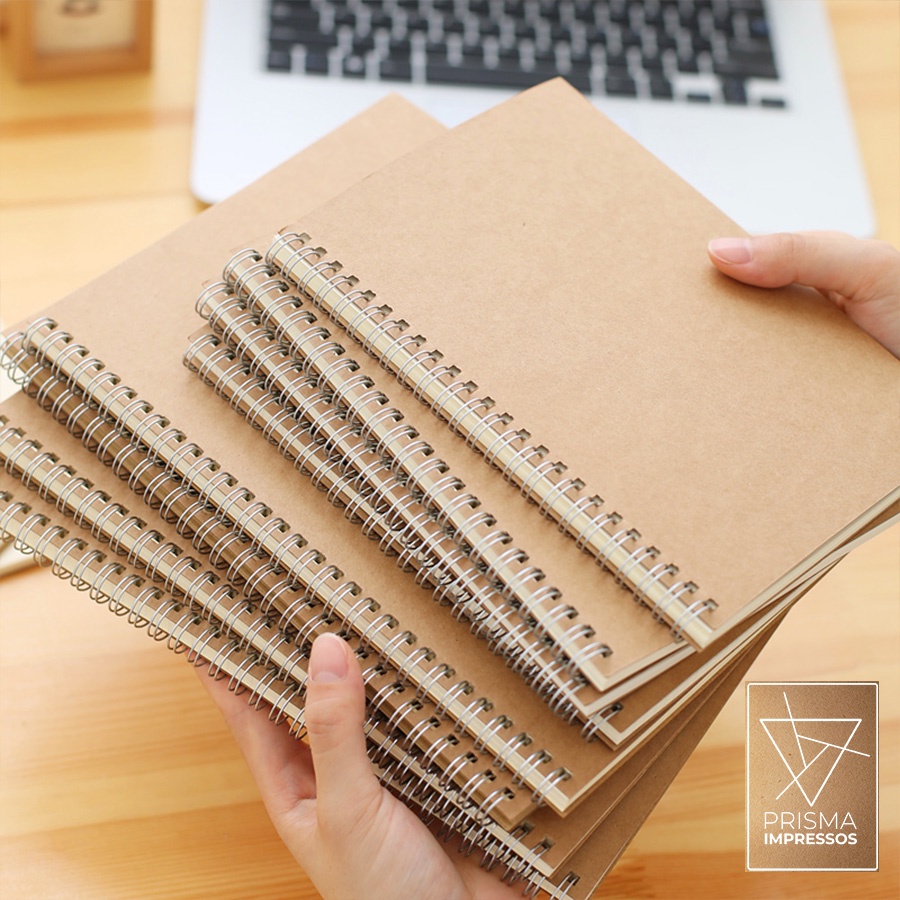 Caderno 21x29cm (A4) com capa kraft, folha pautado ou liso, e espiral metalica ou comum