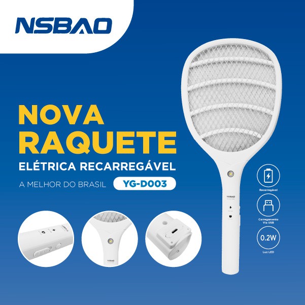 Raquete Mata Insetos 10 Dias de Duração de Bateria Novo Modelo NSBAO Recarregavel Mosca Pernilongos Muriçoca - - YG-D003