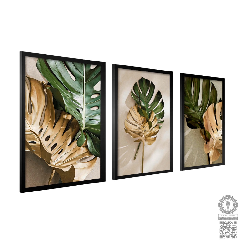 Kit 3 Quadros Decorativos Para Sala Modernos 120X60 Moldura Folhagem Verde e Dourado Grande