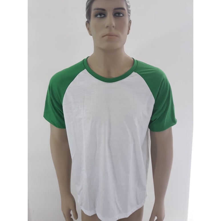 Camiseta Raglan manga Verde com corpo branco 100% Poliéster pronta entrega e com envio imediato