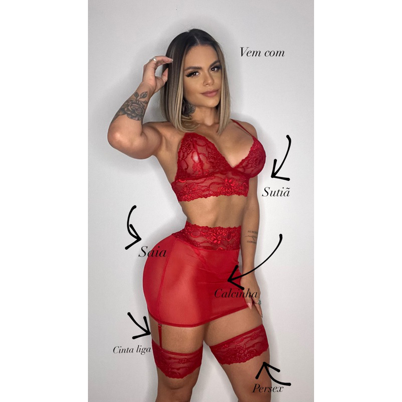 Conjunto Trio Sensual Sexy de Tule Renda Sainha de Renda Sutiã Sem Bojo Cinta Liga e Persex