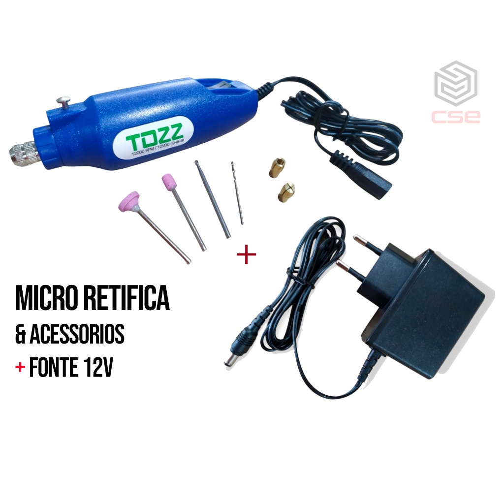 Mini Furadeira e Retifica 12v com 7 acessórios + Fonte De Alimentação 12v 1A Bivolt Para Artesanato em Madeira, Acrílico, Plástico, Porcelana