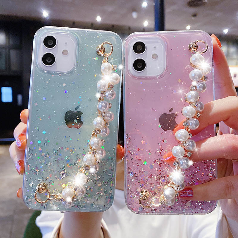 iPhone X XS Max XR 11 Pro Max 6 6s 7 8 Plus SE 2020 Transparent Glitter Bling Pearl Chain Strap Soft Phone Case