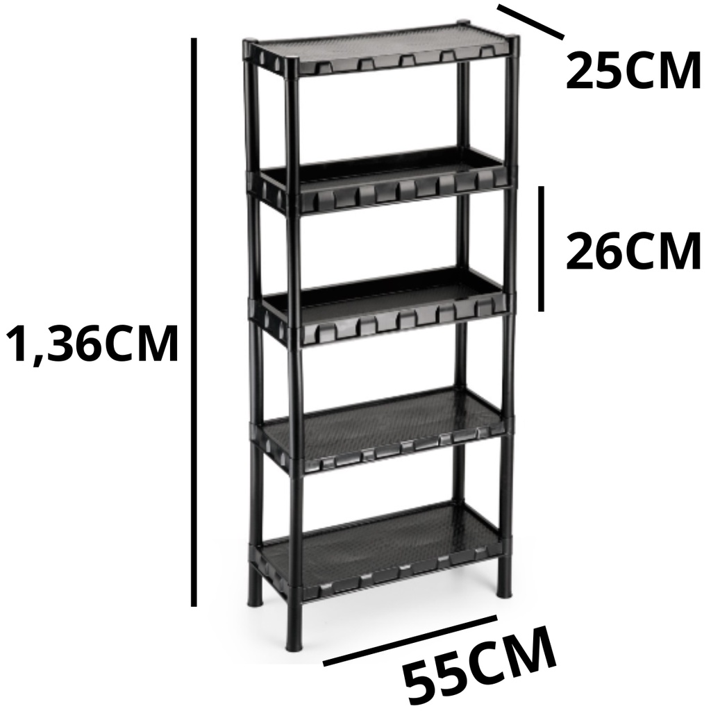 Estante Preta Organizadora de Plástico 5 Prateleiras com Pezinhos Multiuso Utilidades Para Organizar Sua Cozinha Lavanderia Quarto Garagem Salão Livros Ferramentas Objetos Sala Mercearia Quitanda Mercadinho Bomboniere Depósito Estoque Arrumação