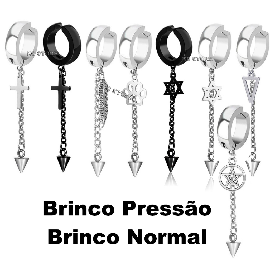 brinco masculino de pressão argola em aço inox penas estrela cruz triangular pet pata cor prata preto com correntinha pendurado spike