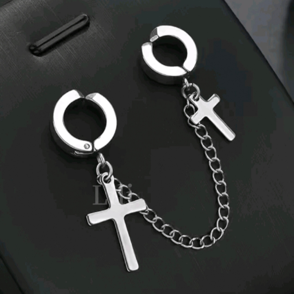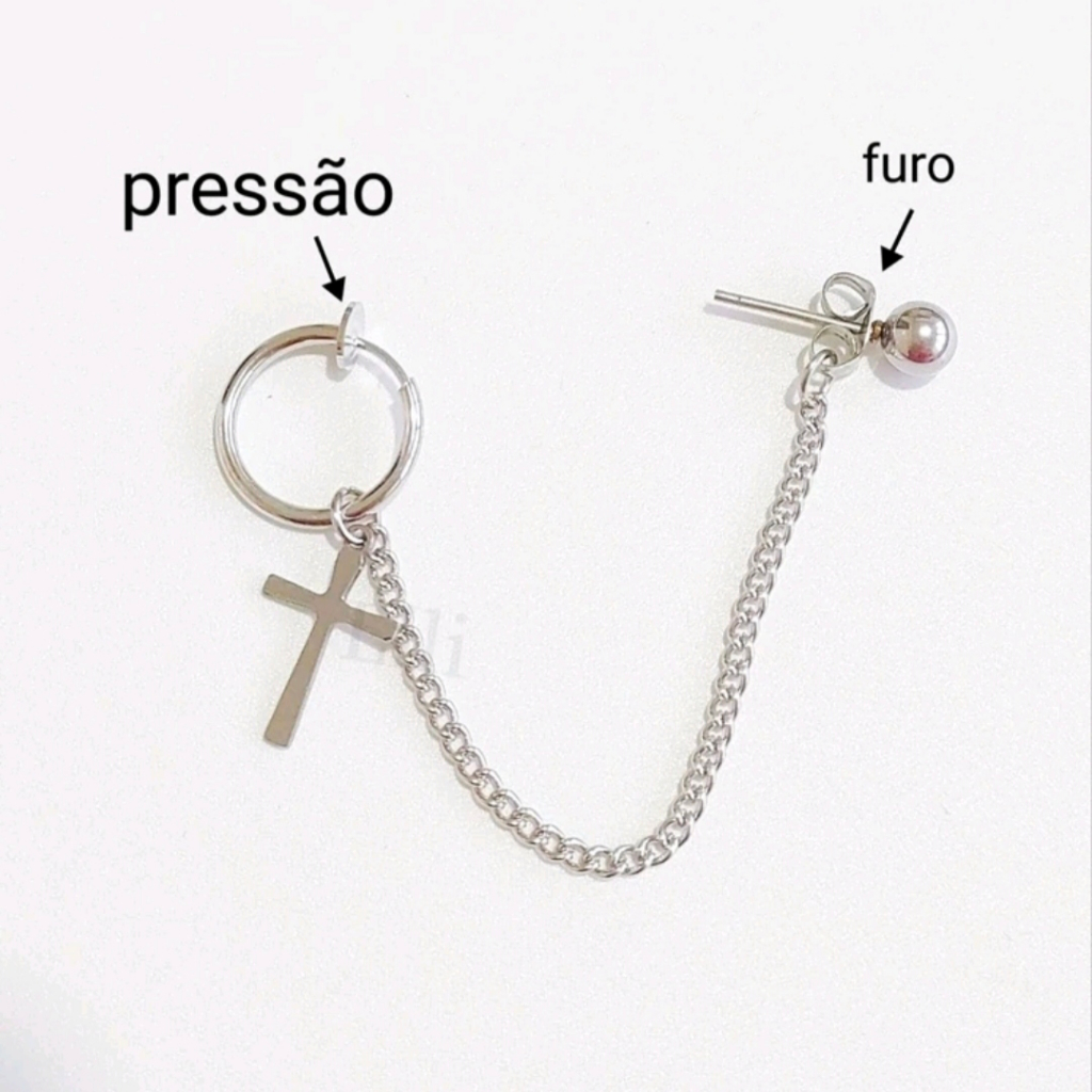 Brinco De Pressão de Argola Com Pingente de Cruz e Correte Aço inox unissex