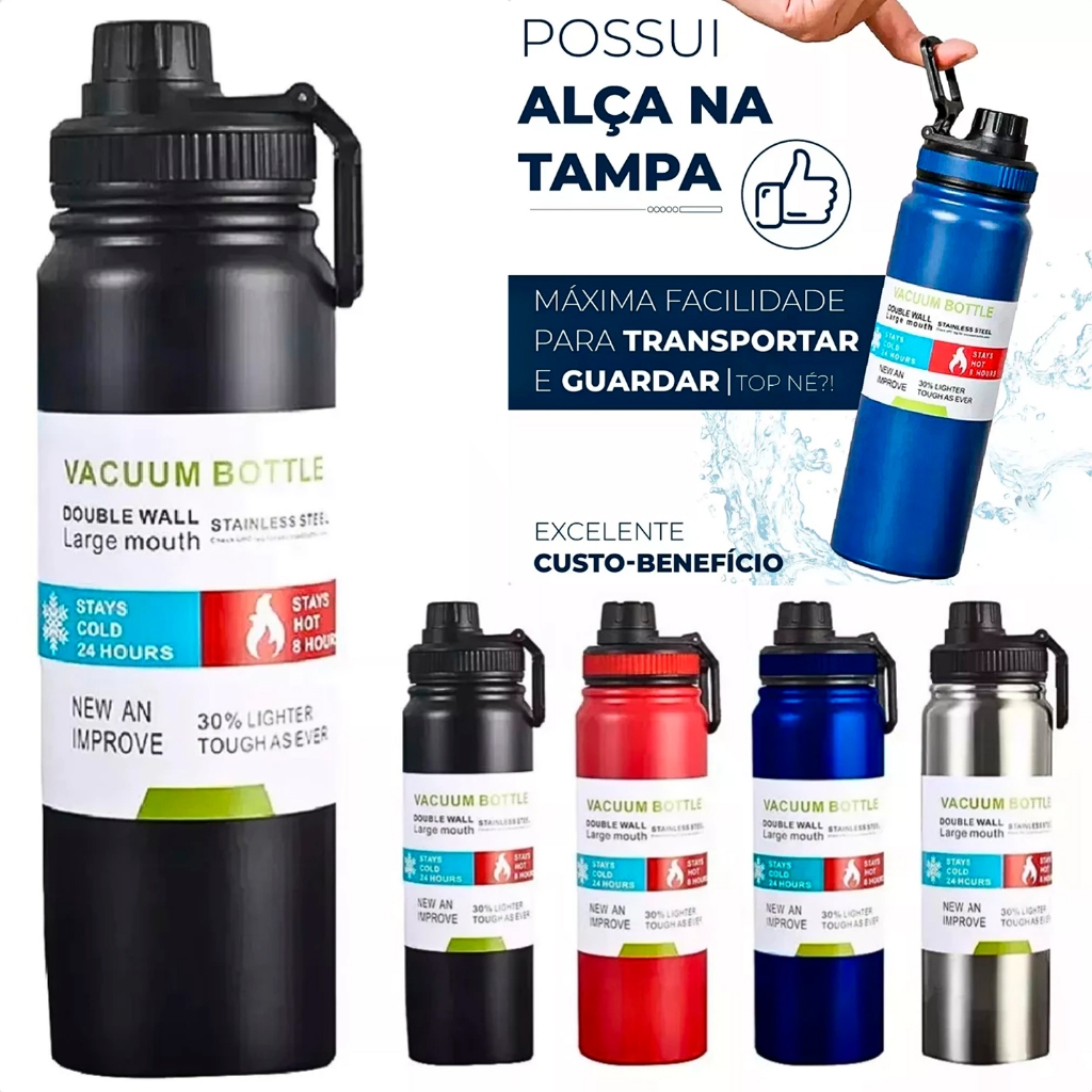 Garrafa Térmica Aço Inox 1 Litro Garrafinha Água Quente ou Frio Parede Dupla Vácuo Mantém a Bebida Gelada por 12 Horas e Quente por 8 Horas com Alça Fácil de Carregar Não Vaza Squeeze
