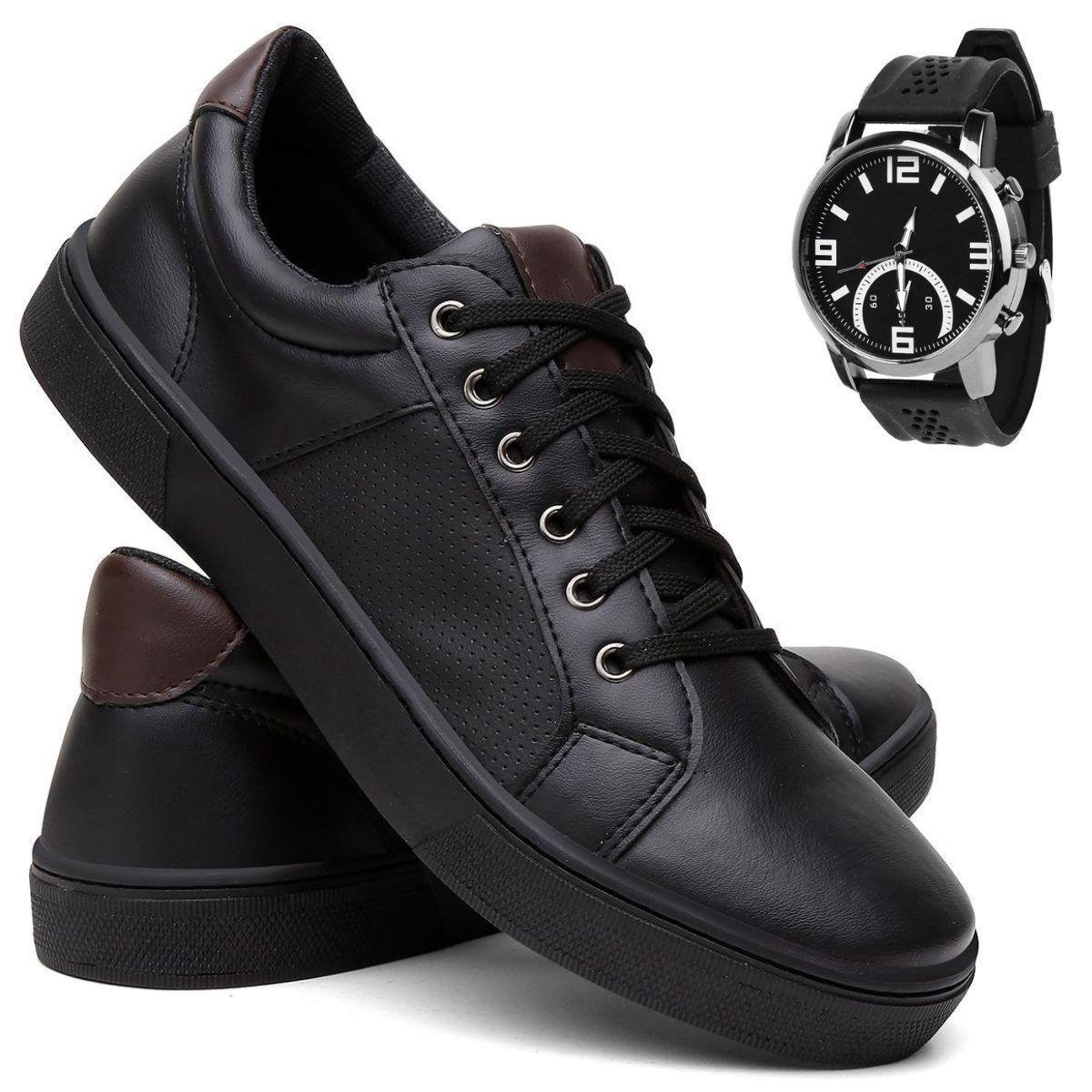 Kit Tênis Sapatênis Masculino Casual De Couro Confortável Leve Cano Baixo Cadarço + Relógio